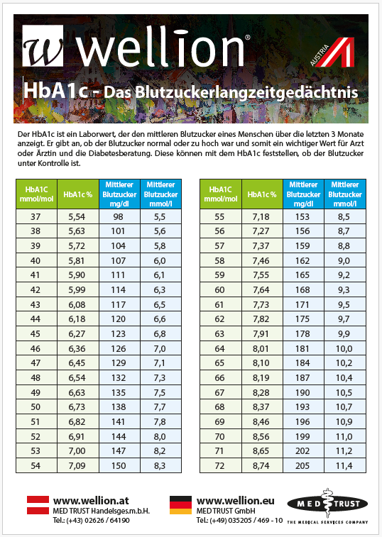 Sie können sich gerne die HbA1c-Tabelle auch downloaden und auf A4 ausdrucken.