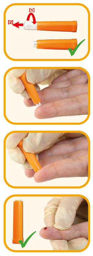 Die Sicherheitslanzette ist sofort einsatzbereit und können einfach aktiviert werden. Sicherheitskappe abnehmen und die Wellion SAFETYLANCET an die gewünschte Einstich-Stelle an der Fingerbeere drücken.